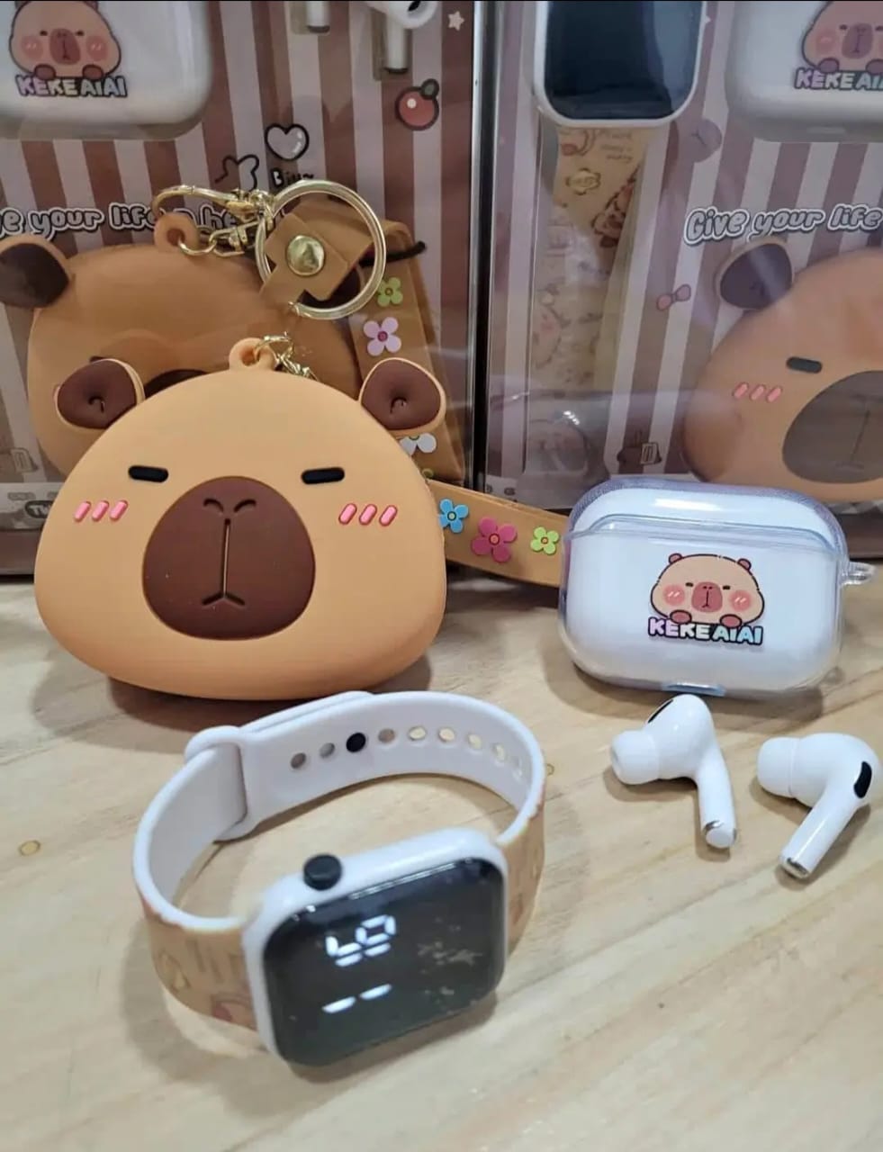 AET LA BUBU ,CUROMI Y CAPIBARA . RELOJ ,AURICULARES Y LLAVERO